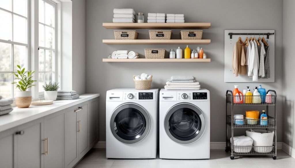 - Hidden storage options like pull-out shelves, gap organizers, and freestanding linen towers keep supplies concealed while maintaining easy access to detergent, cleaning products, and laundry essentials.