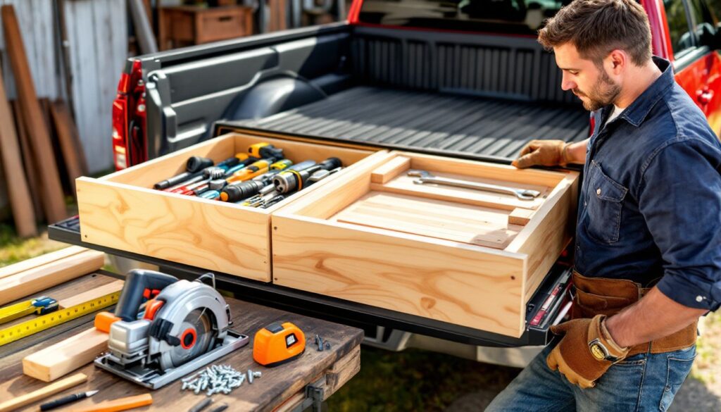 - A sliding drawer system with heavy-duty slides and sealed plywood construction protects tools and equipment while keeping them accessible from the tailgate, typically costing $200–400 to build.